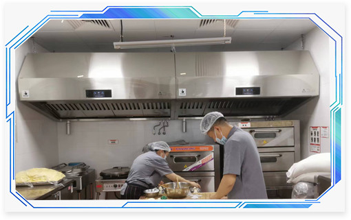 北京西平莊百姓大食堂為了支持響應國家“藍天保衛戰”政策,整個大食堂都采用的這種壹指藍環保油煙機設備,不僅不用向外部排放油煙,還給廚房人員更好的工作環境,更健康的身體。